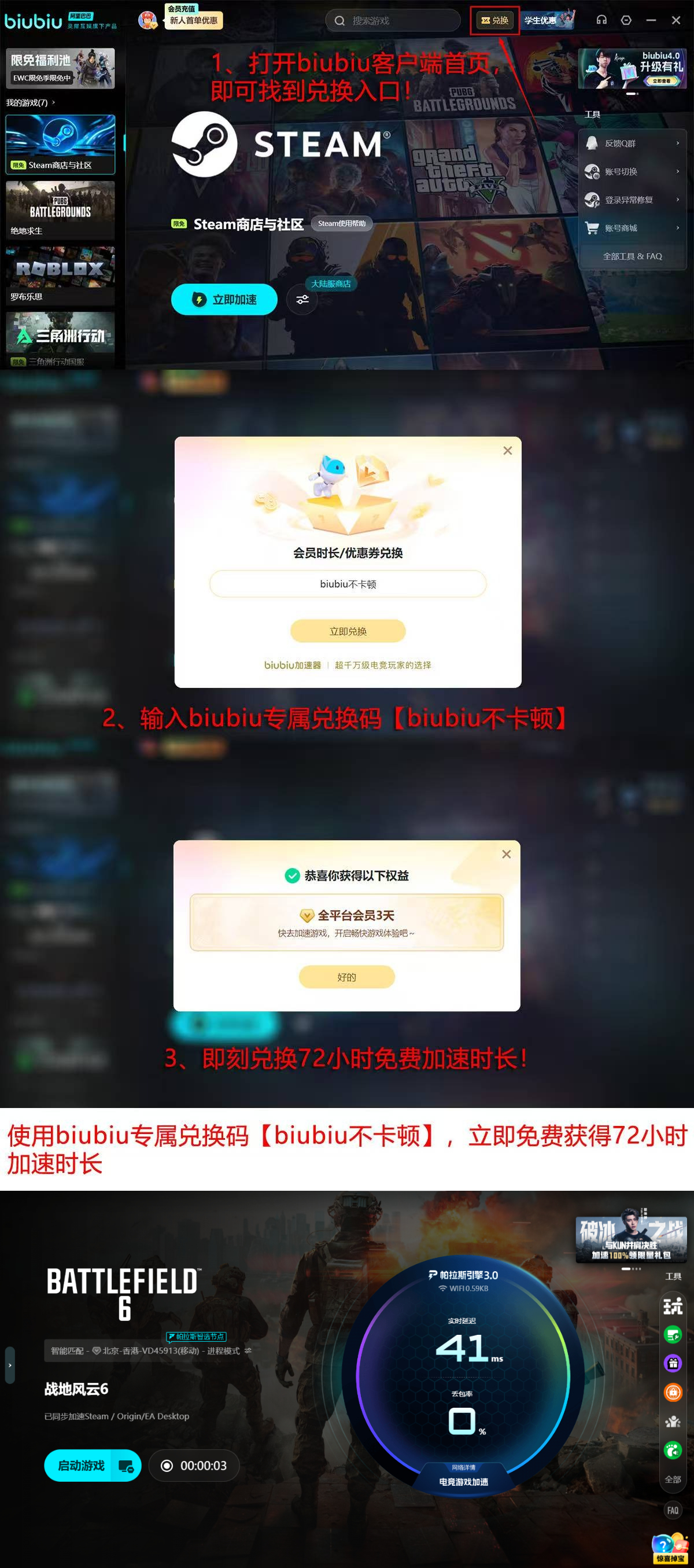 即刻注册biubiu加速器新账号,即可解锁多重新人专属权益:完成注册即激活首日24小时免费加速时长;输入激活码【biubiu不卡顿】,额外获赠72小时加速服务。新用户总计可享96小时高品质游戏加速体验,无缝衔接2月17日开启的《战地6》第二赛季全内容。