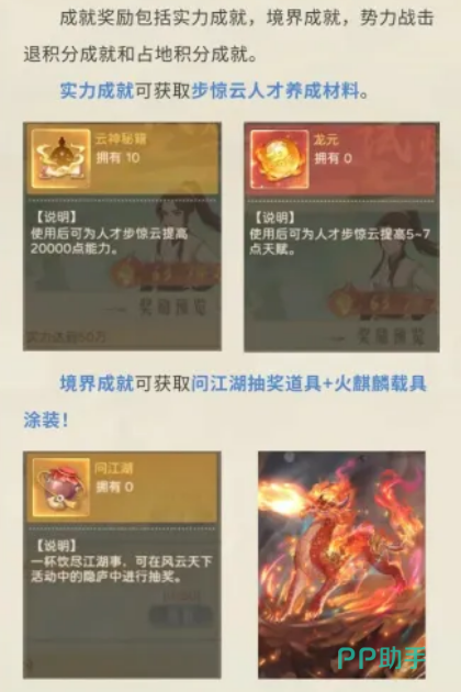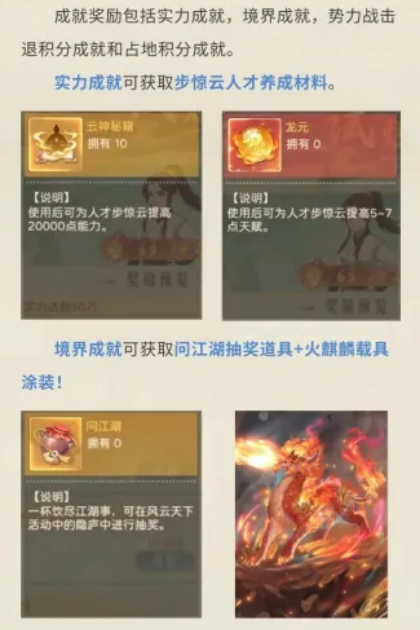 奖励体系划分为成就奖励与排行榜奖励两大板块。成就类奖励中:实力成就发放步惊云专属养成材料;境界成就提供“问江湖”抽奖道具及火麒麟载具涂装;势力战相关成就(含击退积分与占地积分)同样产出抽奖道具与养成资源。“问江湖”抽奖系统位于隐庐场景,可抽取风云限定人才、时装、风云卡强化道具等稀有物品。排行榜奖励方面:境界榜综合境界等级与实力数值排序,奖励包括专属技能道具、风云天下头像框、风云合璧主角时装;势力战个人榜依据总战绩积分排名,首奖为步惊云专属人才信物;势力战势力榜以全势力总积分定名次,同势力所有成员均可共享步惊云养成材料分红。
