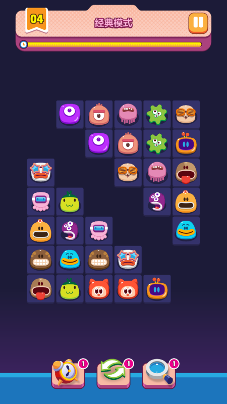 本作严格遵循传统连连看机制:在图案密集的方格棋盘中,寻找两个完全一致的图标,并通过最多三条直线(含两次转弯)完成连接,成功消除。游戏设有时限目标,要求玩家在倒计时结束前清空全部图块。关卡设计由浅入深,初期布局规整,后期引入遮挡、嵌套等复杂结构,持续考验路径预判与瞬时观察效率。全程仅需点击操作,零学习成本,适合碎片化时间娱乐。