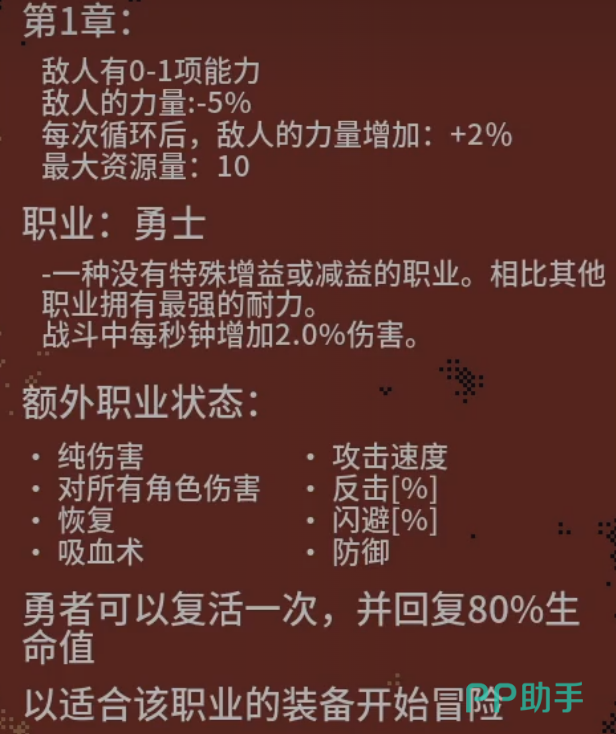 刚开始游戏只能用勇者这个角色,他没有什么特别厉害的技能,属性也都是最普通的,但是耐力值是所有角色里面最高的,还有一次被动复活,复活之后,能回80%的血量。对于刚开始玩的人来说,这个设计挺友好的,打死了还能再站起来,不会一下子就结束。