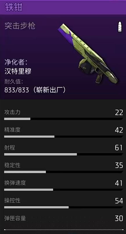 第四个就是铁钳,铁钳同样跟雷霆一样,是属于突击步枪类型的武器,但是它的整体面板效果来说是更加均衡一些,精准度也达到了42,以及攻击能力上面也达到了22的数值,所以在爆发优势上面虽然没有雷霆好,但是他的适配场景会更多一些,大多数的战斗效果当中大家用它的话,可以发现他的优势就是弹夹的容量,在这里一次性它可以发出30发的子弹,比一般的突击步枪都要多一些,而且在高强度的对战当中其实在子弹数量更多的时候,大家是可以快速带来更长时间的持续输出,放在这里的话,关键时刻是非常有用的,对于新手玩家以及各种需要长时间火力输出的老玩家来说,这个武器能够带来的持续作战能力高一些,所以会对于一些有稳定操作的玩家来说,他提供的火力支持也会更更高一些。