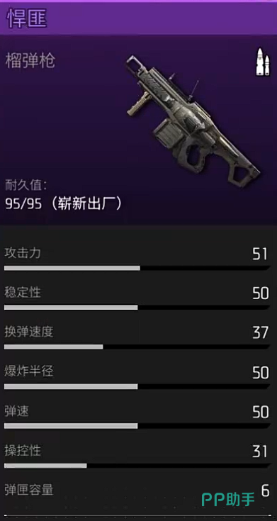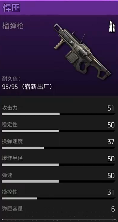 最后为大家推荐的就是悍匪榴弹炮,这里大家可以玩榴弹炮因为它主打的就是高爆发的输出能力,初始的装弹量虽然只有六发了,而且射速也比较慢,但是他在上面换弹的速度是比一般的榴弹炮快一点的,这也解除了一把榴弹炮换弹速度非常慢的一个弱点,装填时间虽然相比其他的武器来说还是要慢一些,但是在这里已经减少了一部分的时间之后,后期在弹药续航上面大家也要注意它的明显短板,这里悍匪的攻击能力确实是非常高,一次性可以达到51的攻击效果,在单次伤害上面比其他的武器都要高出两倍,而且一枚榴弹就可以对很大范围之内的敌人都造成爆炸伤害,这类群体输出效果对于单发伤害来说也是可以弥补其他方面的劣势,不管是弹药补充还是后期的进攻,这个武器都是有一定的空间可以使用起来的。