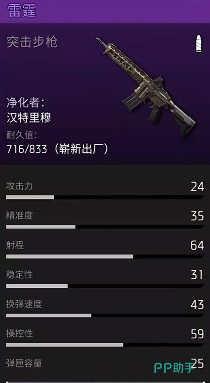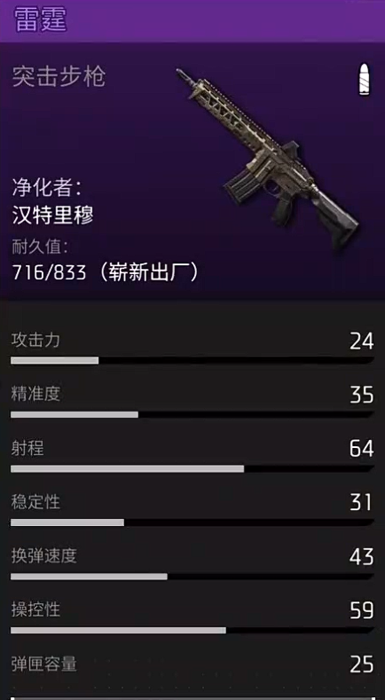 第三个为大家推荐的其实是雷霆,雷霆当前属于是一款突击步枪的武器,它的精准度也达到了35,稳定性31,所以在弹道输出的时候其实有一定的后坐力,所以在整体的视角上面大家会看到有一瞬间的抖动,那么在这里如果大家进行设计的话,散射比较严重的情况下就要进行压强,对于玩家的技术要求来说是比较高的,需要新手玩家前期花费一定的时间来进行练习,后期才可以快速的控制住这个武器的弹道,对于操作比较稳定的玩家来说,驾驭这个武器还是比较你那的,但是如果大家喜欢激进型输出的话,其实玩它也是会有更多快感的,相对于一些需要快速攻击敌人的情况来说,这把武器也是能够满足大家需求的。