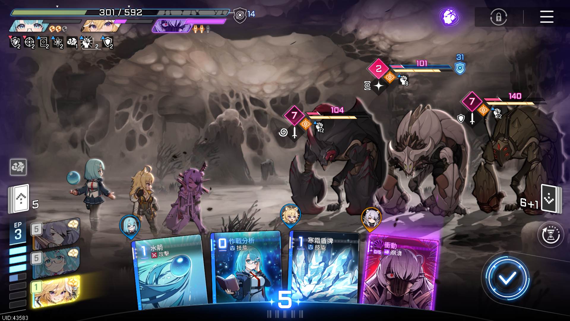 除此之外,创伤模式中,玩家们每个战斗回合都会增加角色的压力,因此快速的解决战斗是玩家的首选,而且战斗的次数越多,后续战斗里怪物血量也就会增加,所以这里建议大家尽量少打普通战斗,避免压力值的快速增加。如果角色在对局过程中进入崩溃状态的话,会导致全队的血量上限减少1/3,且属于该角色的卡牌会全部变成无法造成攻击的崩溃卡牌。玩家需要打完6张崩溃卡牌后才能将角色恢复至正常状态,十分难受。当玩家的血条清空或角色全部陷入崩溃状态时,探索就会失败,因此玩家们需要步步思考,处处谨慎,才能实现最后的通关。