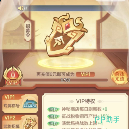 完成6元首充不仅触发元宝翻倍,还将同步解锁限定招募卡池——该卡池独立于常规招募系统,大幅提升赵云等核心武将的获取概率。同时,该笔充值直接激活VIP1身份,并授予“夜三国户籍”专属称号。随着VIP等级提升,后续可开放高级武将定向招募权限、个性化头像框及神秘商店每日额外8次刷新机会,持续强化资源获取效率与账号成长深度。