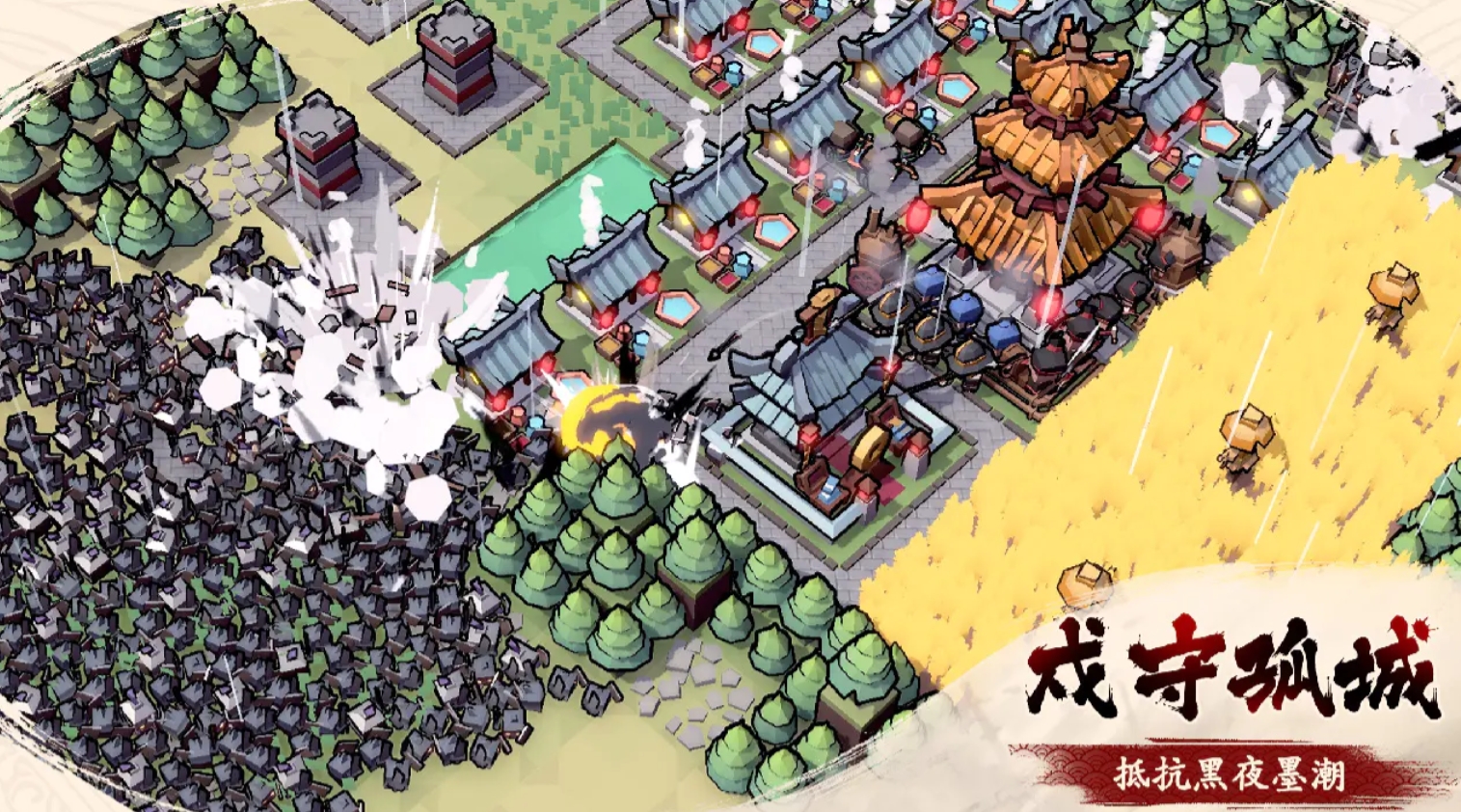 以东方水墨美学呈现策略节奏,《墨守孤城》采用昼夜双阶段机制:白昼侧重资源采集、科技升级与兵营扩建;入夜后转入防守阶段,需指挥部队驻守城门、箭塔、陷阱区等关键节点,抵御波次化进攻。所有单位支持实时指令下达,包括走位微操、集火切换、拉扯风筝等操作,显著提升战斗响应精度与战术执行自由度。