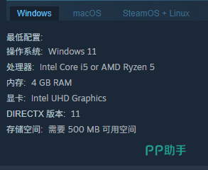 先来看系统需求:游戏最低配置为搭载核显的Intel Core i5处理器、4GB内存及500MB可用存储空间;若追求更流畅体验,推荐使用Intel Core i7级别CPU、NVIDIA GTX 1060独立显卡与8GB内存,存储空间要求不变,仍为500MB。