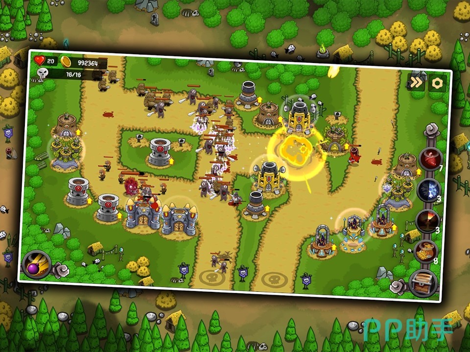 延续系列高完成度的同时,在系统纵深上进一步拓展:四类基础防御塔各自具备两条差异化终极进阶路线(如箭塔可强化单体速射或范围溅射),法师塔支持爆发输出或群体控制分支;英雄不再仅作增益单位,而是拥有独立血量、技能CD与战场定位,能主动拦截精英怪、打断关键技能甚至逆转战局。关卡节奏紧凑,怪物波次设计强调预判与资源预留,难度曲线平滑但富有挑战弹性。