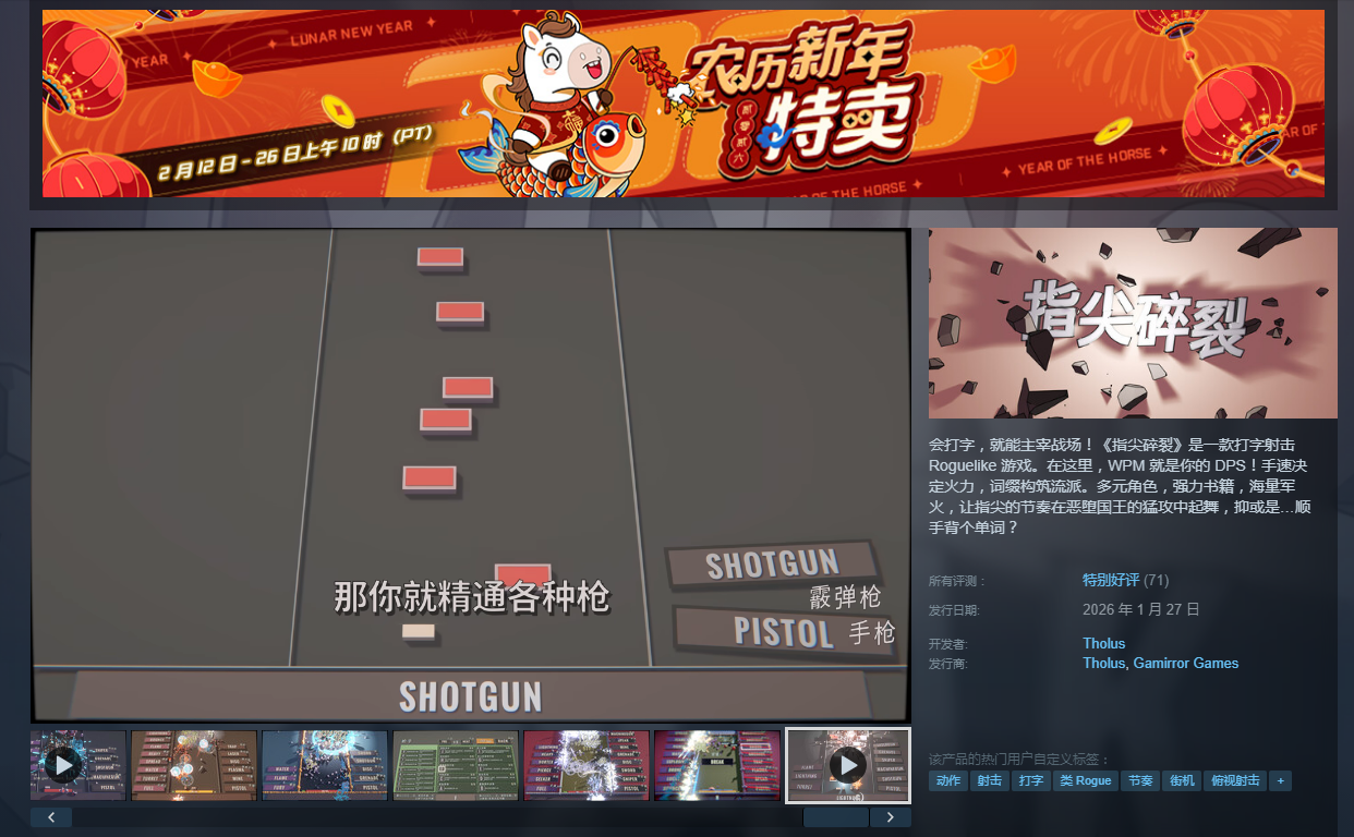 《指尖碎裂》已于2026年1月27日登陆Steam平台,正式开启全球发售。游戏中,输入单词即等同于扣动扳机:键入武器名称或词缀类词汇可激活对应攻击效果;拼写错误将导致连击中断,考验精准度与稳定性。融合Roguelike成长系统,每次通关都会触发随机词库升级、属性加成与诅咒机制,关卡越深入,弹幕密度与节奏压力同步攀升。无尽模式、每日挑战、全球排行榜等模块进一步强化长期可玩性。
