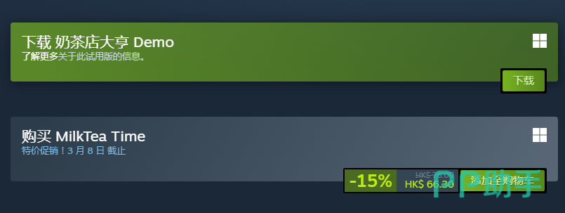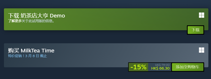 据Steam官方页面显示,《奶茶店大亨》当前正处于限时促销阶段:原价78元,折后仅需66元,享15%优惠,活动截止时间为2026年3月8日。该价格适用于所有Steam用户,无区域或账号限制。游戏支持中文界面与全程语音,适配主流Windows系统配置。