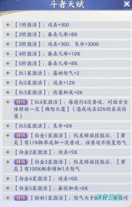 当萧炎天赋完全激活后,每次普攻将额外触发一次“佛怒火莲”效果,该效果独立结算真实伤害,并附带32%固定比例的敌方防御削减。随着角色星级提升,此破防效果可进一步扩展为追加普攻,且所有追加攻击均享受当前怒气等级对应的普攻倍率加成。换言之,高怒气状态下的每一次基础攻击,都可能引发多段高倍率、带破防的真实伤害链,使其成为对抗高护甲、高减伤Boss的首选物理穿透型主C。