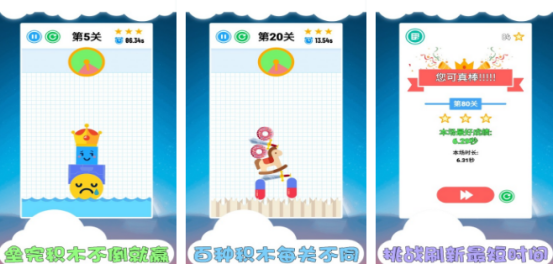 大家可在玩游戏的过程当中锻炼自己的平衡能力,因为有80多个不同的关卡等大家来挑战。起初可能关卡的任务比较简单,只要通过拖动的方式将这些积木放在正确的位置上就可以保持平衡,但是将积木脱下之后,双击屏幕即可掉落到合适的位置上。只不过每款游戏都有时间限制,营造出快节奏的体验感。