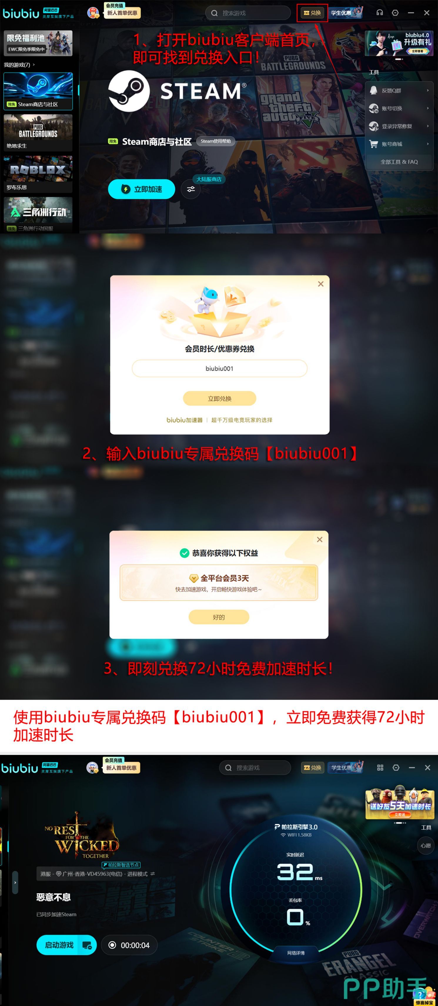为降低用户尝试门槛,官方开放限时福利通道:所有用户输入口令【biubiu001】即可领取72小时免费加速权限;新注册账号在完成首次登录后,系统将自动追加24小时专属时长,两项权益叠加可达96小时连续加速服务。