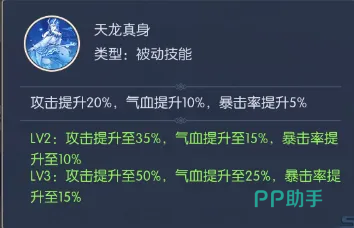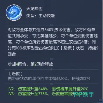 被动技“天龙真身”提供稳定基础属性提升:永久增加20%攻击、10%气血上限及5%暴击率,显著强化生存与输出下限。大招“天龙降世”则体现其作为群体法师的核心定位——对敌方全体存活单位合计造成540%法术伤害,伤害总量固定,由当前存活敌方英雄平均分摊。因此,在敌方减员越多的情况下,单体承伤比例越高,爆发效率越突出。