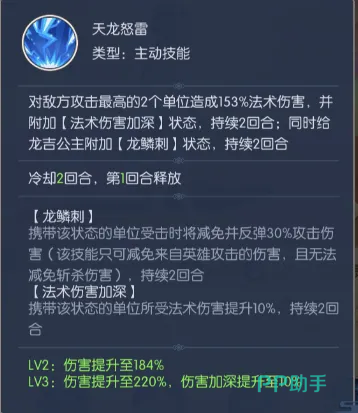 一技能“天雷怒雷”具备精准打击与战术反制双重价值:对敌方攻击力最高的两名目标分别造成153%法术伤害,并施加持续2回合的“法术伤害加深”效果;同时为自身附加“龙鳞刺”状态,持续2回合。该状态使龙吉公主在受到英雄普通攻击时,可减免并反弹30%所受伤害,但该减伤不作用于斩杀类伤害,且仅对来自敌方英雄的攻击生效。