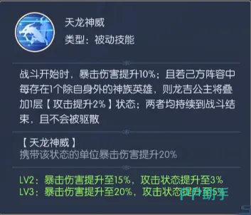 该技能还设有双重限制与附加机制:单体承受伤害上限为施法者攻击力的6倍;同时有10%概率为目标施加持续2回合的“恐慌”状态,处于该状态下的单位命中率降低10%。另一被动“天龙神威”在战斗开始时即生效,使龙吉公主暴击伤害提升10%;若己方除她之外每拥有一名神族角色,即可额外叠加1层“攻击+2%”效果,该增益不可驱散、持续至战斗结束。此外,“天龙神威”本身还额外赋予20%暴击伤害加成,两项暴击增益可叠加生效。