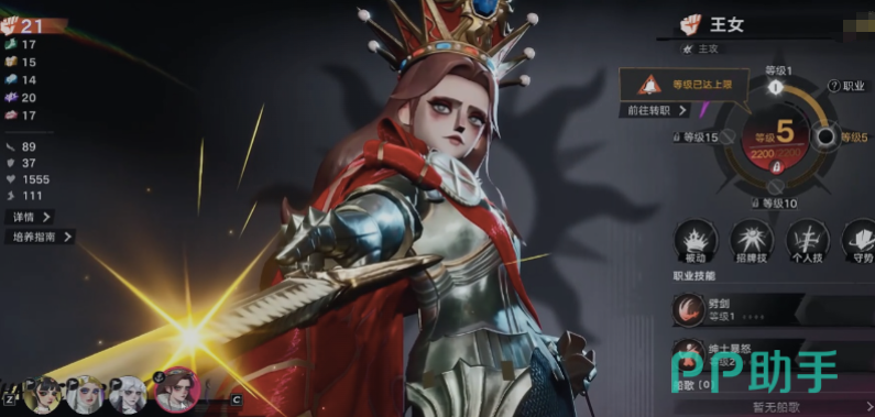 “王女”为测试阶段实装的主力输出型角色,标志性皇冠造型凸显其身份设定。她以“战意”为核心资源:一技能可瞬发140%攻击力伤害并快速积攒战意;二技能“猛斩”消耗20%当前生命值,对单体造成180%攻击力伤害,并再获得一层战意;终极技基础伤害为120%攻击力,但当战意值≥50时,伤害将获得显著提升。整套技能链强调资源管理与爆发节奏,尤其擅长针对低防御单位实施高效斩杀。