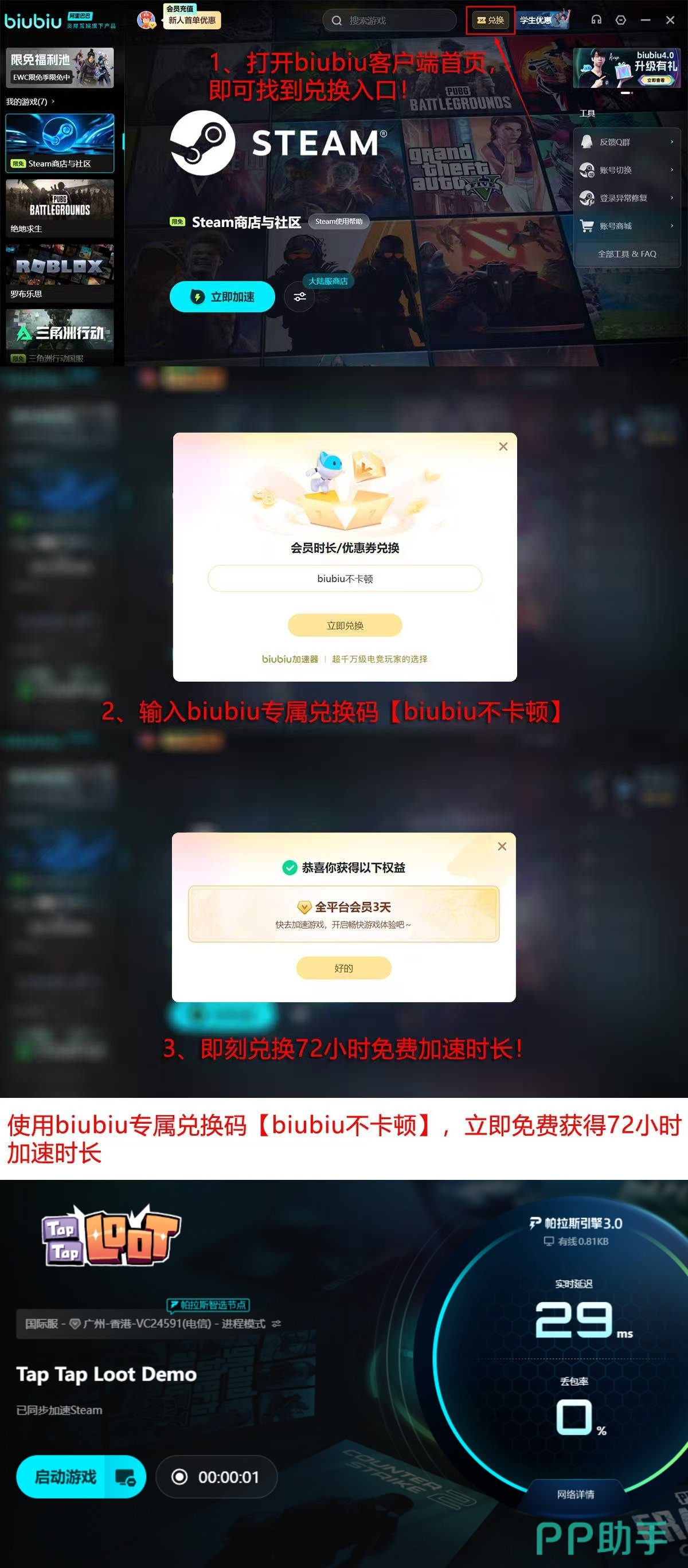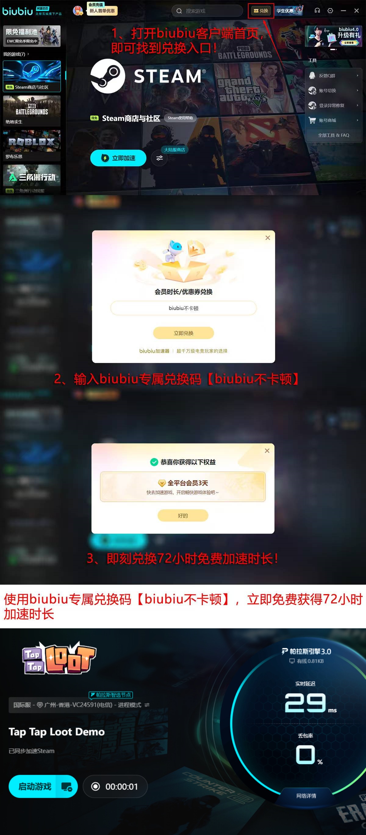 针对新用户顾虑,biubiu加速器提供零门槛试用方案:完成手机号注册后,系统自动激活24小时全功能加速权限;在客户端内输入口令“biubiu不卡顿”,即可即时领取额外3天连续加速时长。两项福利叠加,总计可享4天无限制服务,覆盖完整下载+初期游玩周期,无需付费即可验证实际效果。