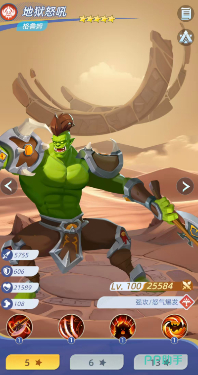 末位补强推荐地狱怒吼·格鲁姆,专司怒气爆发与残局收割。其群攻技能为横向旋转斩击,对全体敌人造成100%物理伤害,并有30%概率附加流血;普攻则拥有60%概率触发追击,再次造成100%物理伤害。当生命值低于30%时,格鲁姆将立即恢复20%生命值,并获得30%攻击力与30%速度提升,兼具反杀潜力与机动性,是完善兽族群伤队输出闭环的理想人选。