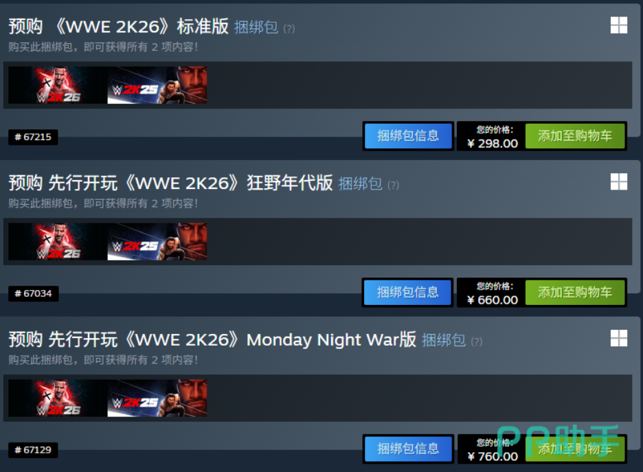 目前WWE2K26共推出三个官方零售版本:标准版售价298元;狂野年代版定价660元;Monday Night War版为760元。后两个限定版本除包含全部基础内容外,额外收录多组专属传奇选手阵容、专属剧情章节及高精度角色皮肤,但核心操作逻辑、战斗判定系统与基础模式结构均保持一致,无本质性玩法差异。