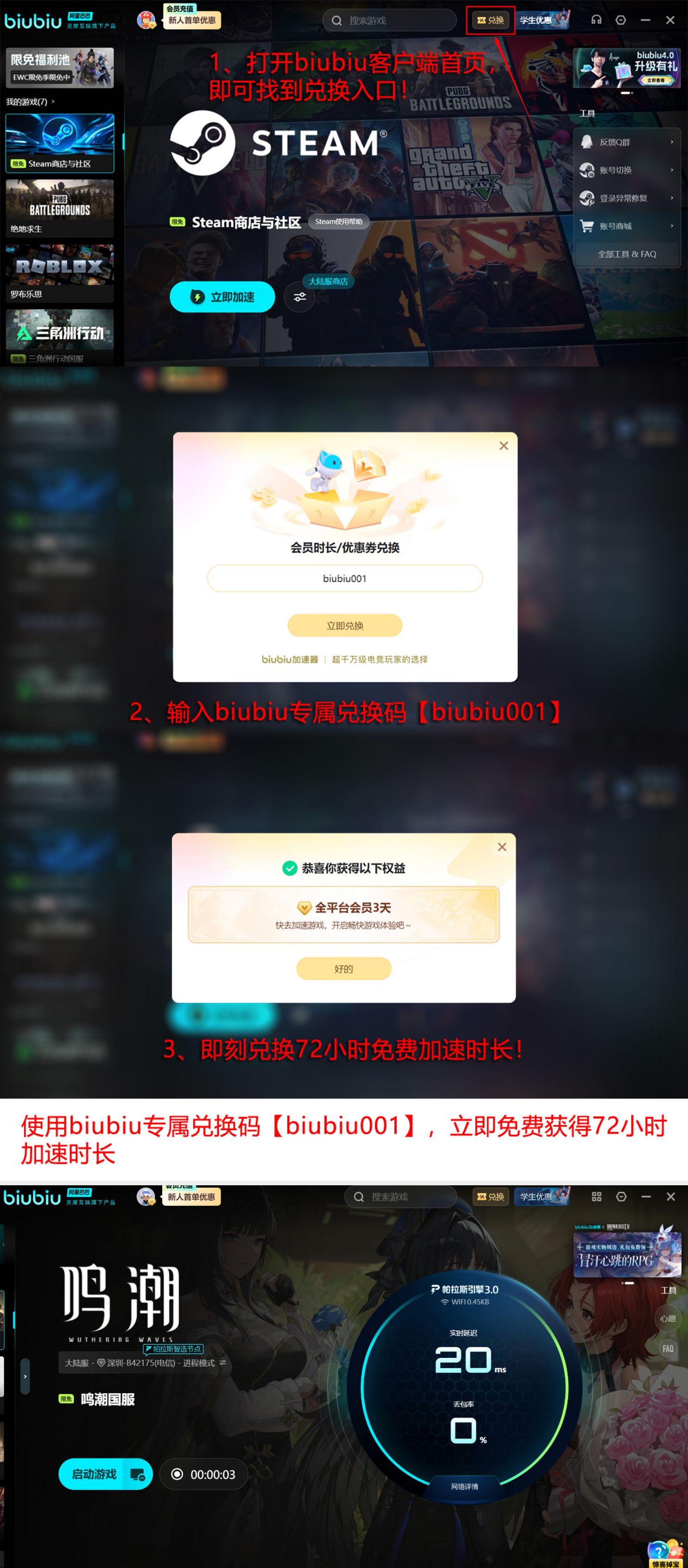 新用户首次注册即可激活24小时全功能加速权限;完成基础绑定后,输入专属兑换码【biubiu001】还可额外领取连续三天免费使用权。两项权益支持叠加生效,总计可享96小时无限制加速服务,覆盖游戏登录、副本挑战、联机协作等全部场景,且不设功能壁垒。