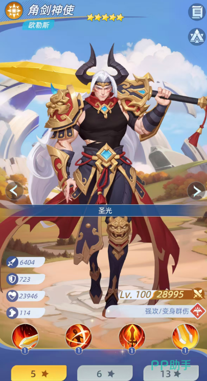 角剑神使作为圣光队的核心强攻位,具备显著的群体压制能力。其主动技能“破军”初始可对全体敌人造成100%物理伤害,且将所造成伤害的5%转化为自身生命值;成长至后期后,伤害提升至140%,转化比例跃升至45%,并附带削减目标25%怒气值的效果,有效延缓敌方关键技能释放节奏。被动技“天神下凡”则赋予其高生存韧性:当生命低于50%时,立即变身为持铭剑神,清除全部控制与负面状态,恢复20%生命,并为所有己方圣光单位施加“圣光号令”增益;同时全程提供20%常驻伤害减免,大幅提升全队持续作战能力。