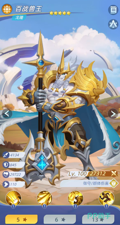 百战兽王戈隆承担前排承伤与反打职能。其群体输出随等级成长显著,后期具备高额AOE潜力,并有50%概率附加“伤害降低”减益。释放技能前,自身暴击率提升20%,普攻转为对敌方全体造成40%物理伤害,且40%概率施加减速效果。更关键的是其被动复活机制:当受到致命伤害时,以自身最大生命值20%的比例强制存活,并立即获得15%攻击提升,确保前排具备二次输出机会与战术延续性。