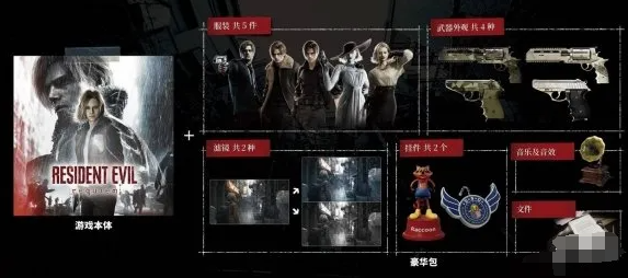 豪华版专属“豪华包”内含5套主题角色服装:格蕾丝可装备“八尺夫人”与“黑色电影”风格造型;里昂则提供“生化危机4原版”“黑色电影”及“末日”三款独立设计。此外,还配备两组差异化视觉滤镜——“末日滤镜”强化压抑惊悚氛围,“黑色电影滤镜”复刻胶片质感与光影层次。武器外观方面,共覆盖4种类型,含“末日主题”手枪等高辨识度涂装。另附两款兼具装饰性与功能性武器挂件:“浣熊先生”与“DSO徽章”,其中部分挂件额外提供属性加成,兼顾视觉表现与实战价值。豪华版独占“浣熊式音乐音效包”,完整还原初代《生化危机》标志性的合成器配乐与环境音效体系。