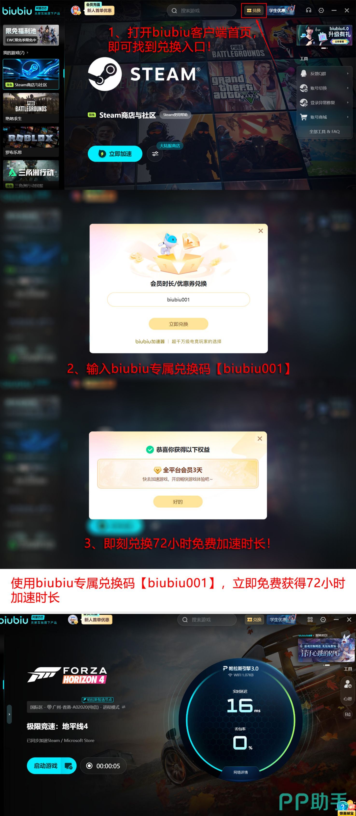为降低用户尝试门槛,平台同步推出限时福利活动:输入激活口令【biubiu001】即可领取72小时免费加速权益;新用户完成注册后还可额外获赠24小时新手时长,两项福利支持叠加使用,总计最高可享96小时无限制加速服务,适用于所有参与活动的用户群体。