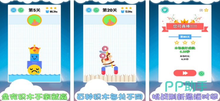 物理引擎驱动的堆叠挑战,平台具备动态重心响应机制。随着堆叠高度增加,基座会发生可控倾斜与弹性晃动。玩家需预判积木落点重心偏移量,结合平台实时姿态完成精准投放。失败判定基于整体结构倾角阈值,强调手眼协调与动态平衡感知能力。