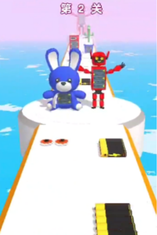 角色续航依赖电量系统:赛道中随机分布蓝色电池与红色电池。拾取蓝色电池可存入能量储备,累计满5颗即激活“加速充能”状态——角色移动速度提升20%,持续4秒。若电量耗尽,玩偶将坠入海域,游戏立即结束。