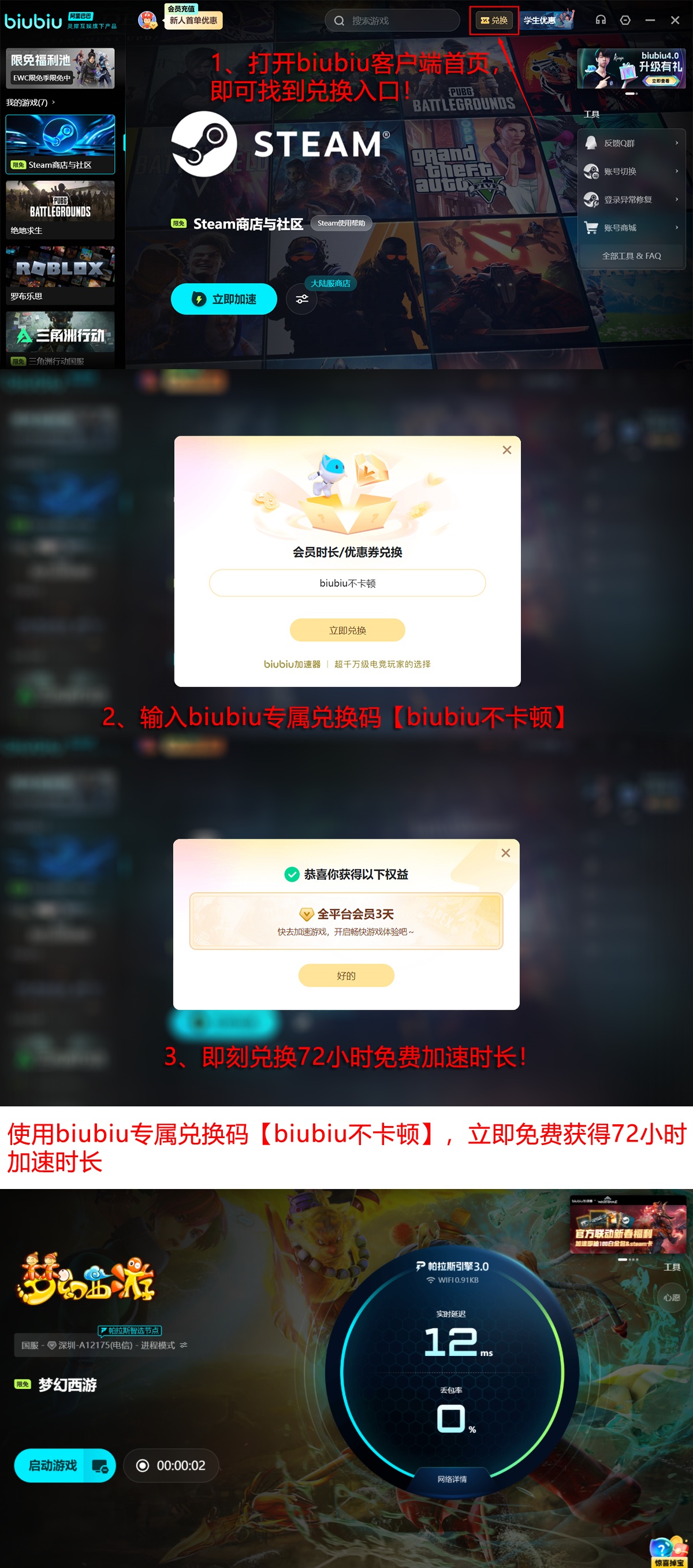 针对新接触《梦幻西游》的玩家,biubiu加速器提供零门槛接入方案:注册并登录账号即可自动激活24小时免费加速权益,一键启用即刻享受稳定连接;此外,输入专属兑换码【biubiu不卡顿】,所有用户均可额外领取连续3天的全功能加速服务。