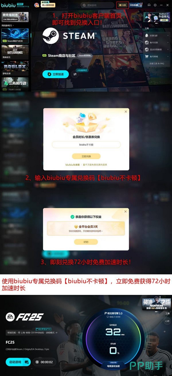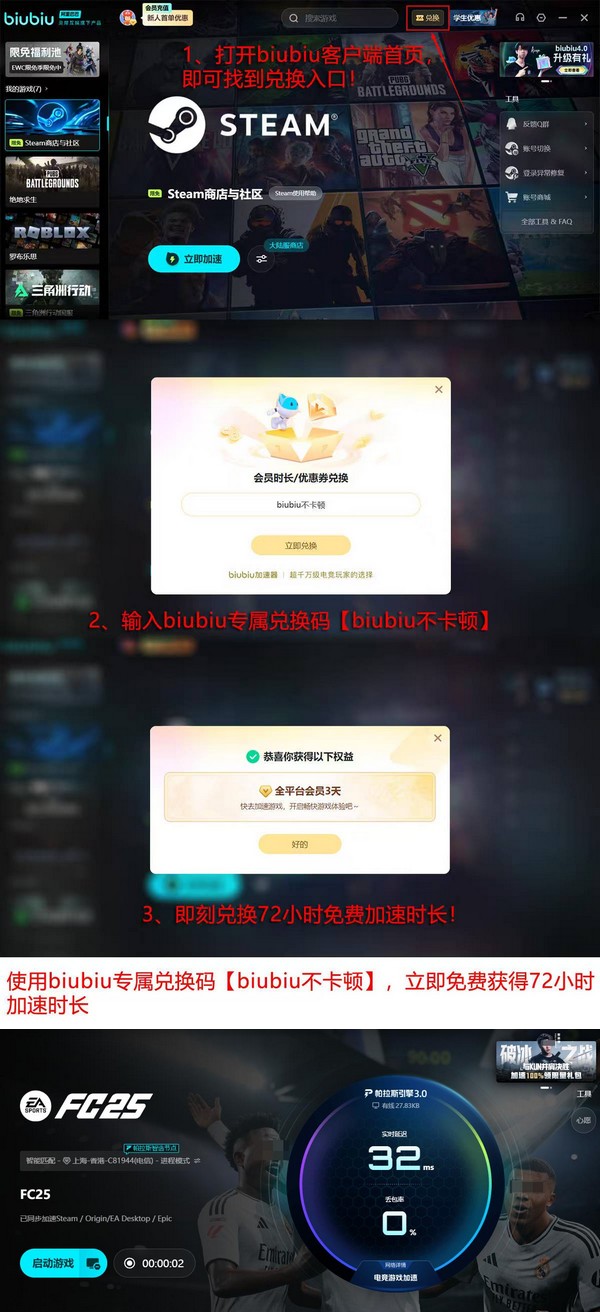大量实际用户反馈显示,在启用biubiu加速器后,《FC 25》的登录成功率、匹配响应速度及游戏过程稳定性均有明显改善。该方案亦获得职业电竞领域认可,知名《PUBG》赛事冠军选手左梓轩参与其网络策略协同优化工作。软件界面简洁直观,零学习成本,新注册用户可立即获赠24小时全功能免费加速时长;使用完毕后,输入专属兑换码“biubiu不卡顿”,还可额外领取72小时加速权益,累计达96小时无忧体验。
