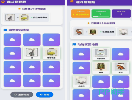 融合记忆匹配与生态模拟玩法的益智类单机应用。玩家通过翻开卡片识别动物种类,并依据其自然栖息属性(如北极熊对应寒带环境),在虚拟地图中精准定位并构建适配家园。每成功搭建一个动物栖息地,即可解锁新区域与奖励资源,推动动物园系统持续扩展,兼具知识性与收集成就感。