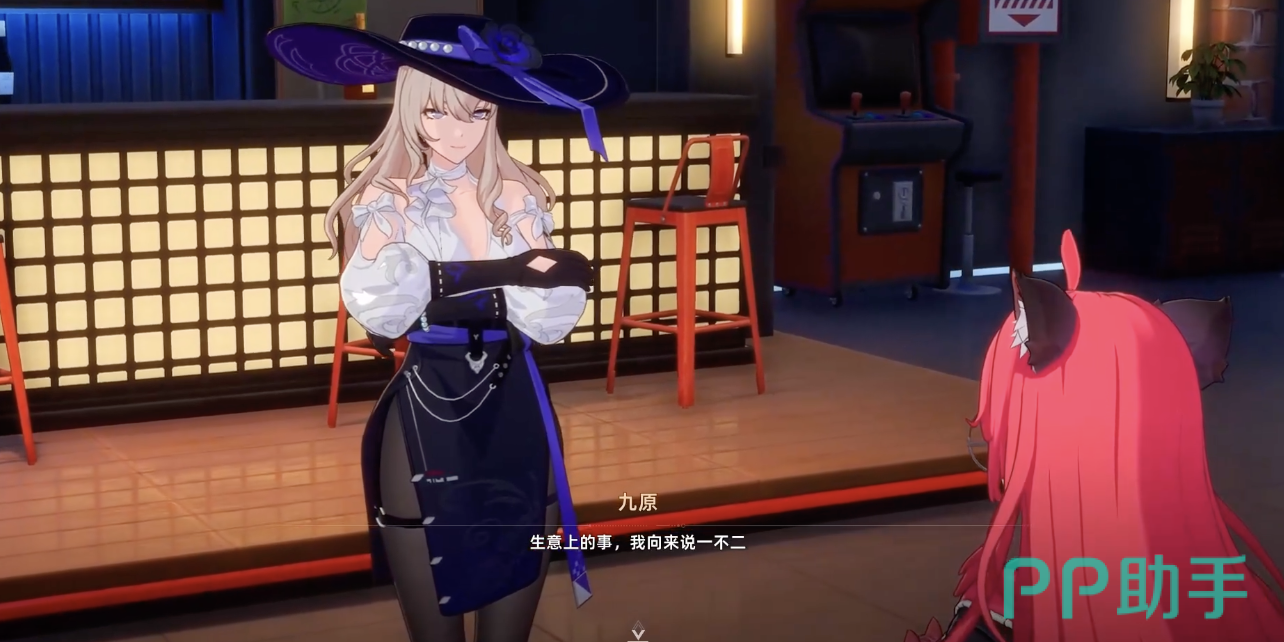 在角色塑造层面,九原拥有鲜明的视觉辨识度:白金色长卷发搭配宽檐紫调礼帽,融合英伦古典美学与现代幻想风格;白色挂脖式裙装强化其端庄气质,整体造型在角色群像中具备强烈记忆点。这种高完成度的人物建模不仅服务于美术表现,也为后续剧情展开预留了丰富的叙事空间——其沉静外表下所隐藏的性格特质与背景脉络,正随主线推进逐步浮现。