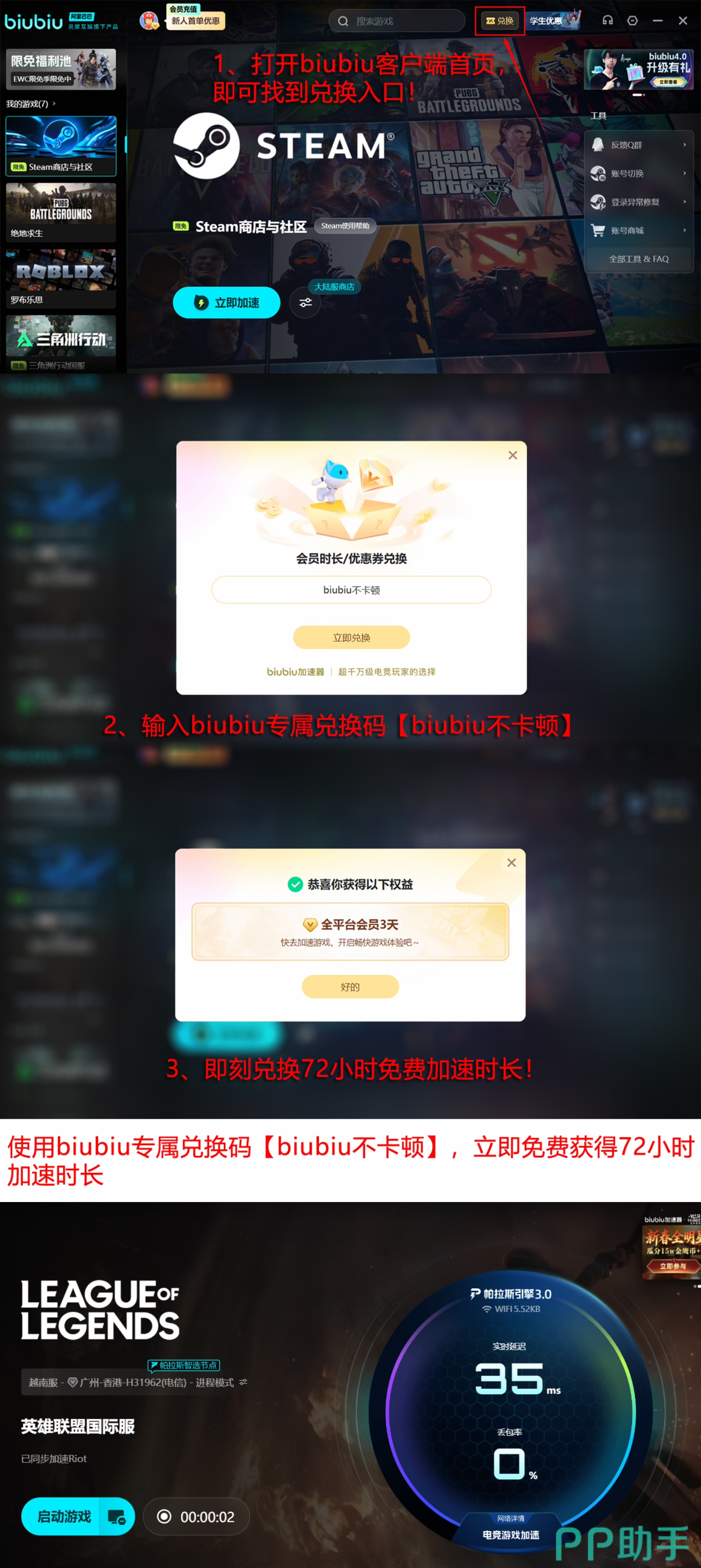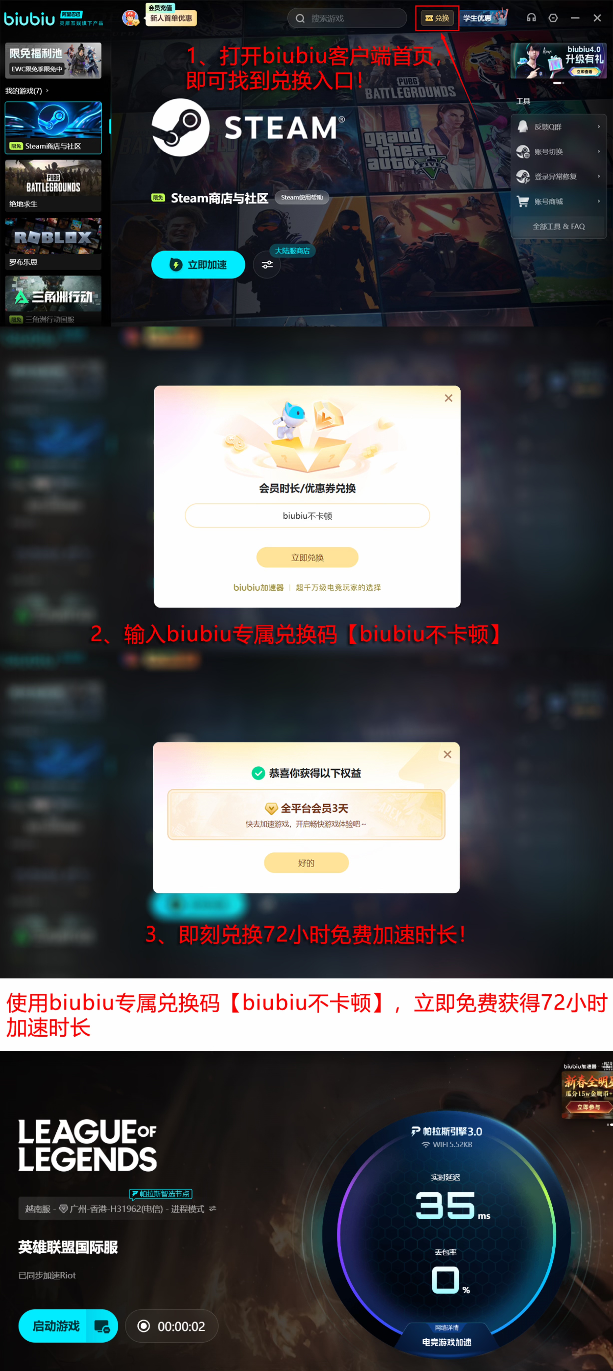 新用户完成首次注册并登录后,系统将自动发放24小时全服通用加速时长。所有用户(含老账号)均可在加速器内输入口令【biubiu不卡顿】,免费领取额外3天越南服专属加速权益。两项叠加后,新注册用户最高可享累计96小时无限制加速服务,覆盖完整新手适应周期与多场高强度排位赛需求。