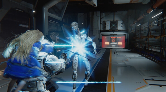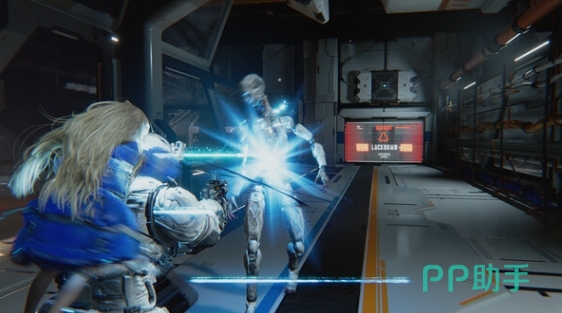 本作最具辨识度的设计在于“双角色实时协同系统”:玩家需在同一战斗场景中同步操控两名主角——休与戴安娜。休代表物理维度的生存能力,负责近身格斗、环境交互与重力适应性移动;戴安娜则专精于电子战领域,可悬浮附着于休肩部,并实时入侵敌方设备、瘫痪防御节点,甚至在关键时刻触发超频模式扭转战局。尤其在低重力月面环境中,二者动作节奏、技能衔接与空间位移的配合,构成了整套战斗逻辑的战略支点。