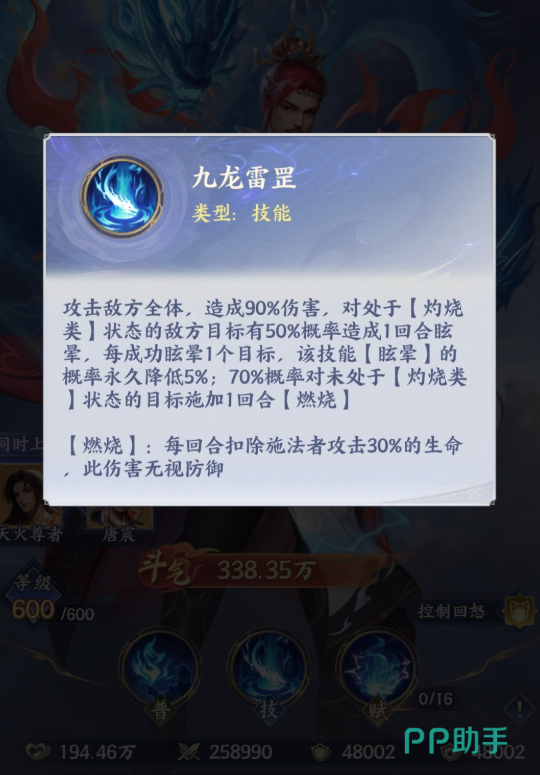 九龙雷罡其实就是唐震的最强功能的一个技能效果,想要发挥唐震的最大潜力就要用到,这个技能释放的时候,能对全体敌人施加灼烧状态,重点是哪怕敌方没有被灼烧,也能强制触发,相当于开局就能给敌方全员挂 debuff,同时还能附加眩晕效果,打断敌方的开局技能释放,这一点真的太关键了,尤其是面对那些开局就放爆发技能的敌方阵容,唐震开局一个九龙雷罡,就能直接打破前期对面的节奏,而且后续每次命中处于灼烧状态的单位时,唐震自身的斗气积攒效率还会提升,所以这个时期斗气攒得快,就能更频繁地释放技能,还有一点大家一定要注意,这个技能没有防御减免机制,伤害结算不是看敌方的防御,而是基于目标当前的攻击力,所以哪怕面对高防阵容,唐震也能打出稳定的压制力,不会出现打不动的情况,这也是他比其他火系角色更实用的地方。