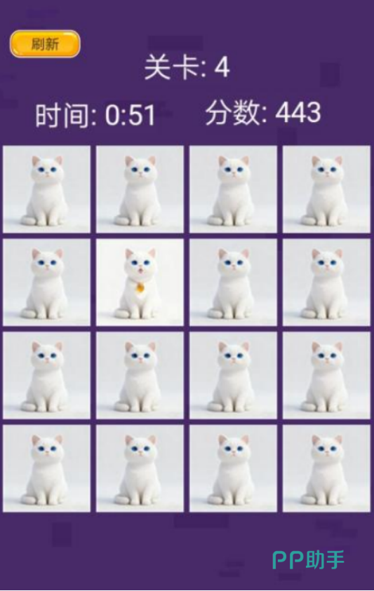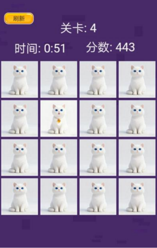 采用经典的找不同玩法为核心,比较考验的就是大家的眼力。有众多关卡组合而成,关卡的难度都是循序渐进的,大家在初次闯关的过程中,将会看到很多极其相似的猫咪,但其中又夹杂着很多微妙的差异,比如猫咪的眼睛或者是身上的装饰物颜色不同等等,尽可能用最短的时间顺利完成闯关。