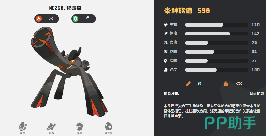 这里给大家推荐的还有一个燃薪虫燃薪虫当前它自身的灼伤特性其实是非常高的,而且还可以造成百分百扣血的一个能力效果,在场的时候燃薪虫如果叠加到更多的灼烧能力时,也可以注意在自身的花种能力上面,可以带来的双开花输出效果也是非常强的,后期除开了一些火系免疫的能力之外,它也是可以造成多长和上场都能够造成压制能力的强度,后期如果要想培养他的性格,建议大家可以关注一些是否可以带来灼烧效果的技能,挂的灼烧层数越多的情况下,它的各方面能力自然也会更好用,而且后期如果有引燃类型的技能也会带来更高的冲击力。