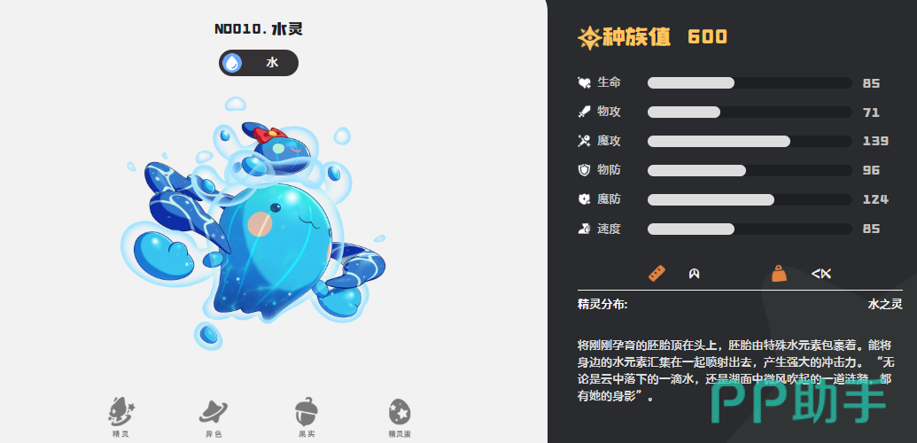 第二个为大家推荐的就是水灵,水灵当前其实在整体的强度当中,它是可以绝对的克制住地面系以及火系精灵的,它是此类精灵的克星,而且在对付NPC的时候,大家用它的各类技能也是可以保护住自己,比如说水炮盾之类技能在保护自己的同时,还可以发出一些水泡进行循环攻击,那么用它的特性之后,大家就要注意,这里能够叠加起来的话,它后期可以用一些高能耗的技能,这类技能一般在输出的时候威力也是会更高一些的,而且前期大家选择了水灵的话,它的坦度也是非常高的,所以在后期想要强杀一些对手的话,它的此类技能也是可以派上用场,大家就要注意后期在为它配招的时候,如果有增加速度效果的技能是一定要为他搭配上的,而且特攻能力不能减少速度的技能效果上面,水炮以及水泡盾这些都是可以放在他身上一起使用的,还有天洪这个技能也比较搭配他整体的技能效果。