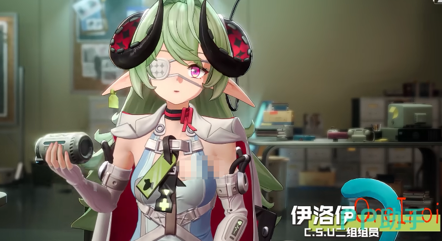 然后是伊洛伊,这个角色外观看起来年龄不大,整体的人物制作也比较符合低龄化的视觉表达,她胸前的十字标记看起来是比较像一个治疗类型的角色,但大家不用以为她是传统的奶妈角色,因为她的定位更特殊,游戏中伊洛伊的名字源自北欧梦境神祇,再加上她头上的恶魔角和脸上的遮眼布设计,能看出她的异能偏向幻境类的效果,所以很多玩家预测她的能力是可以给敌人施加睡眠、混乱或者命中率下降之类的群体减益,既能辅助续航,又能打软控的话她就是后期强度很高的一类多功能支援角色,就是不知道这个角色是否会这样制作。