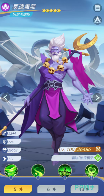 冥魂蛊师:这个角色叫做阿尔卡纳斯,可以为我方全体恢复相当于攻击力100%的生命值,虽然看起来像一个输出角色,但是在其中他可以为其中生命最低的1个目标附加灵魂复生的效果,灵魂复生是在他死亡后会根据施法者攻击力400%的生命值复活,而且他的普通攻击可以变成为我方生命比例最低的目标恢复攻击力45%的生命值的效果,同时还有70%概率可以驱散目标1个减益效果,这个技能可以连续释放5次的时候,大家就不用担心其他成员被对面给控制住了。