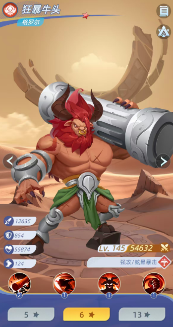 狂暴牛头:名字是格罗尔,输出虽然是具有群伤的特点,但是一般是用来对后排敌人造成203%伤害,并有25%概率为目标附加眩晕的效果,普通攻击的时候也有15%概率附加眩晕,所以用这个角色的话大家就看眩晕能不能用好,这个技能能够用好的话,这个角色就是强势的,后期他还有一个生命值低于50%时,获得20%暴击提升的滋味增益,这方面的效果大家也可以看成是他当前比较好用的自我提升能力啦,而其他方面的效果当中大家就要看其他的队员是否可以跟格罗尔相互配合。