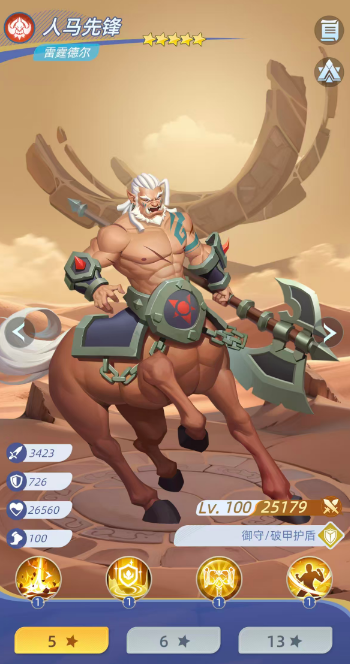 人马先锋:叫做雷霆德尔,技能效果当中可以对敌方前排造成203%的物理伤害,并有20%概率对目标附加眩晕,后期进行强化之后的他在释放怒气技能后,70%概率给自己和随机1个友方附加生命护盾,护盾最大能吸收施法者生命上限10%的伤害,且自身的增益效果是可以提高8%伤害减免和8%抗控率,放在对战场上他就是一个很难被敌人给控住的角,同时可以施加的护盾对于前期生存能力比较弱的时候带来的优势还是比较好用的。