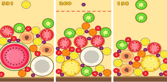 从屏幕最上方会逐渐掉下不同的水果,水果的等级也完全不同,比如有最小的蓝莓,或者最大的大西瓜等等。在这些水果掉下来之前,大家必须左右滑动屏幕放置在正确的位置上,将两个相同的水果放在一起就能快速合成,只要直至合成大西瓜就能完成闯关。