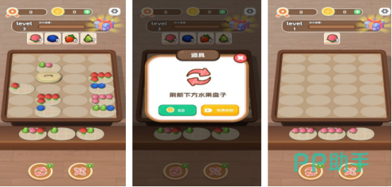 美味的水果全部随机打乱顺序摆放在水果盘子当中,可能一个盘子里会有2~3种不同的水果,比如草莓或者是蓝莓等等。在屏幕最下方又会呈现出三个空白的盘子,大家可通过手指滑动的方式,将相同的水果放在同一个盘子中,以此快速消除,屏幕最下方又会呈现出两种辅助道具,包括刷新或者是提示。
