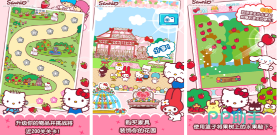 凯蒂猫的果园是此游戏的主要背景,大家要通过采摘或者是精心装扮的方式,让自己的果园环境变得非常精美,其中有各种各样的关卡内容,都有不同的任务挑战等大家来完成。需要在规定的时间之内取得良好的成就,这样就可让自己的果园独具特色,还可获得硕果累累的成就感。