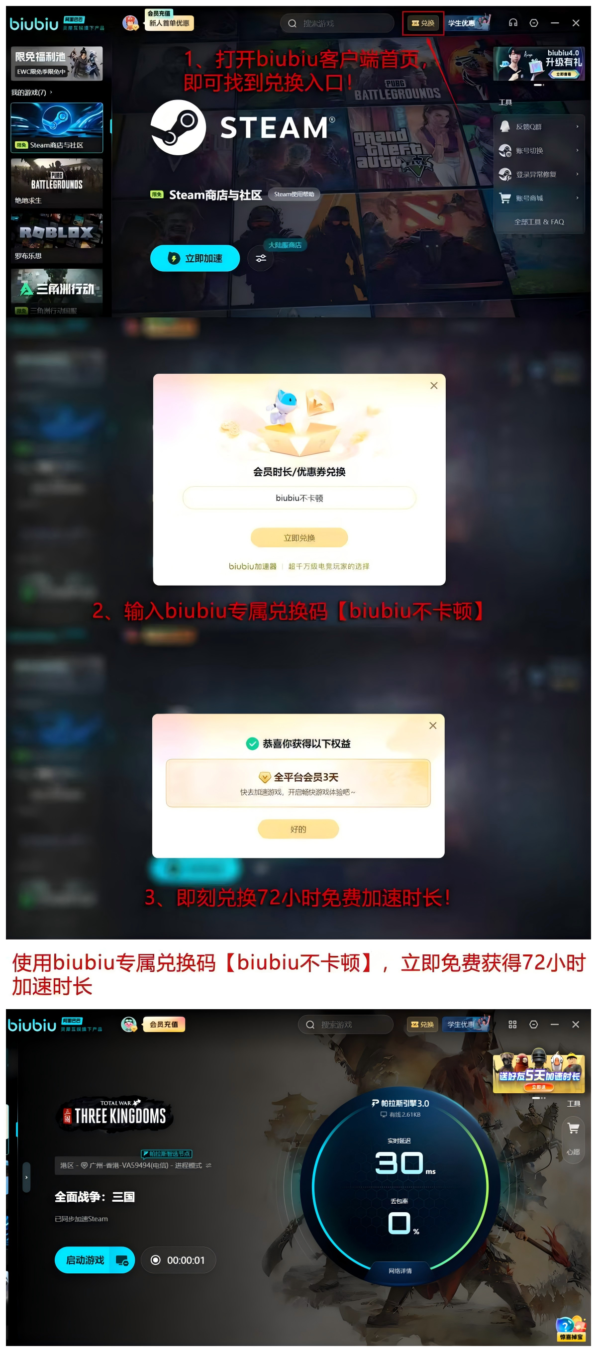 新用户注册后输入口令【biubiu不卡顿】,即可立即领取72小时连续加速权益;叠加新人首单福利,还可额外获得24小时加速时长,总计达96小时。该组合权益有效期独立计算,建议关注平台限免活动节奏,合理规划兑换时间以延长体验周期。