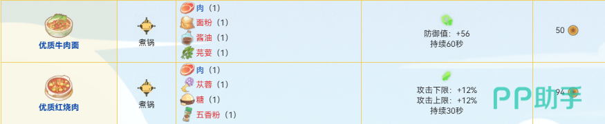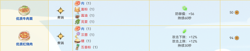后期特色主食聚焦长效增益与场景适配性。沙米年糕由沙米与糖制成,沙米产自东滩沙田,成品体积小、保质期长,是跨区域远征必备口粮。佼佼小面为高阶面食代表,需面粉、肉、排骨、苜蓿及十八种混合辣椒,其中混合辣椒需完成“香料商人”支线后解锁合成配方,食用后提供持续60秒的移动速度+12%与体力恢复加速效果。优质牛肉面需肉、面粉、酱油、芫荽,相较基础版额外增加芫荽带来的专注力加成,适用于需要频繁操作的建造类任务。沙茶拌面以面粉、沙葱、酱油为核心,制作耗时最短,是日常巡镇与NPC对话时的理想选择。疾风炒饭需米、土豆、蛋、酱油,四类材料均为高产出基础资源,食用后触发“疾风状态”,5分钟内所有行动体力消耗降低20%,覆盖跑图、挖矿、建造全场景,被多数资深玩家列为后期常驻料理。